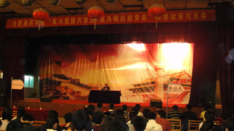 为迎接中国共产党成立90周年,辛亥革命100周年,使广大团员青年深入了解党和国家的重要形势、政策和基本国情、省情,4月20日晚19时,我院“我与祖国共奋进,我为崛起献青春”形势政策报告会在大学生活动中心如期举行。合肥通用学院党委副书记、副院长田启昌应邀为广大团员青年做了题为《安徽省十二五发展规划及对高技能人才的需求》的专题报告。各系团总支带领全院五百余名团员青年聆听了本次报告会。