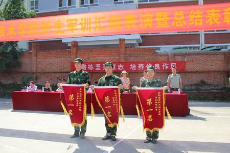 最后学院院长助理、学生处处长陈立老师宣读了嘉奖令,通报表彰在各项军事训练过程中涌现出来的先进个人及团体。校领导向获奖代表颁发了锦旗和奖状。在热烈的掌声中,2013级学生军训总结表彰大会结束,为期九天的军训工作圆满落下了帷幕。