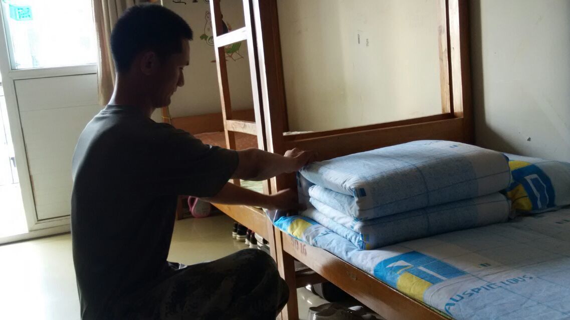 2015级学生军训团组织了内务卫生安全检查和评比活动。由承训部队教官组成的内务检查组,对新生宿舍进行了逐一检查评比。所有宿舍按照军事化标准,对内务进行了彻底的清洁整理,宿舍一尘不染、被子和生活用品摆放整齐有序。
