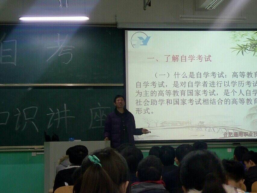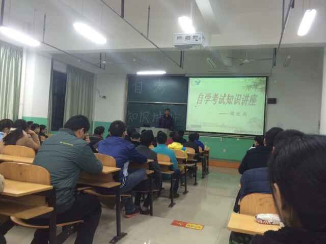为帮助我院学生进一步了解自学考试,更好地自学,提高学习质量,2015年11月25日下午5:00,我院自考协会在综合楼101教室举办了自考知识讲座,由基础部周业兵老师主讲。