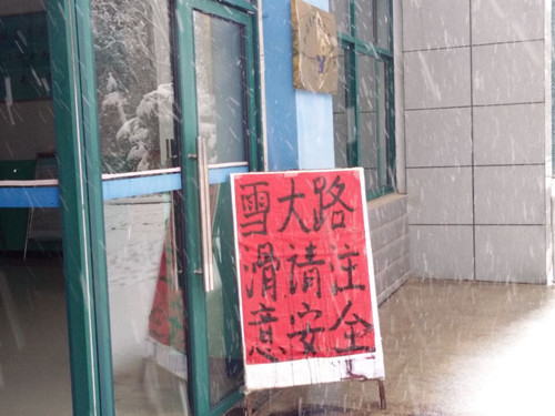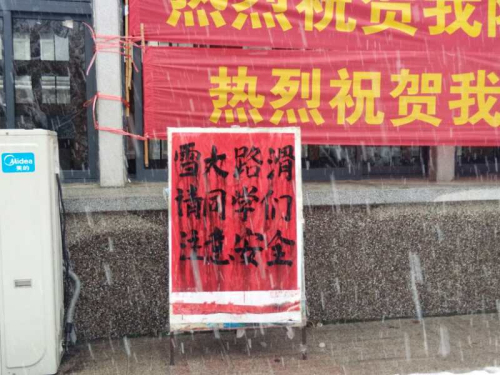 1月4日,为消除积雪给学校道路交通带来的诸多不便,学院团委及各个组织发在学院各交通要道放置了警示牌,提醒同学们注意安全。