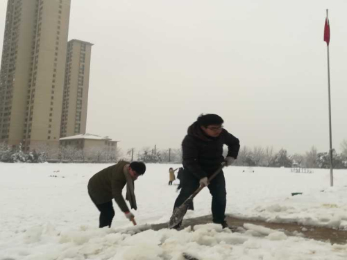 1月5日。我院学生拉动小伙伴自发地组织铲雪。虽然雪积的比较厚,但这一点也没有影响参与者的热情和工作效率,大家分工明确,铲的铲,扫的扫,学校的主干道、俱乐部门口以及操场的楼梯等处积雪被清理干净。